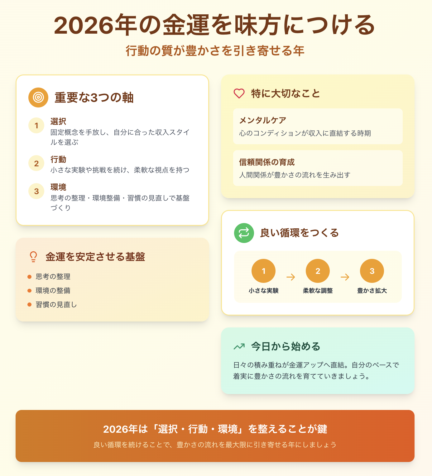 2026年は「行動の質」が金運を大きく左右する年です。固定概念を手放し、自分に合った収入スタイルや行動を選ぶことで、豊かさの流れを引き寄せやすくなります。思考の整理、環境の整備、習慣の見直しといった基盤づくりが、金運を安定させる力になります。